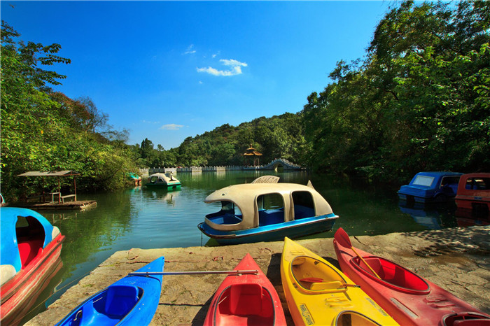 深秀湖取《醉翁亭记》中"蔚然而深秀"而得名,湖水上源琅琊溪,清澈透底,九曲桥、湖心亭、玉带桥与四周山色相映,泛舟垂钓,其乐无穷。